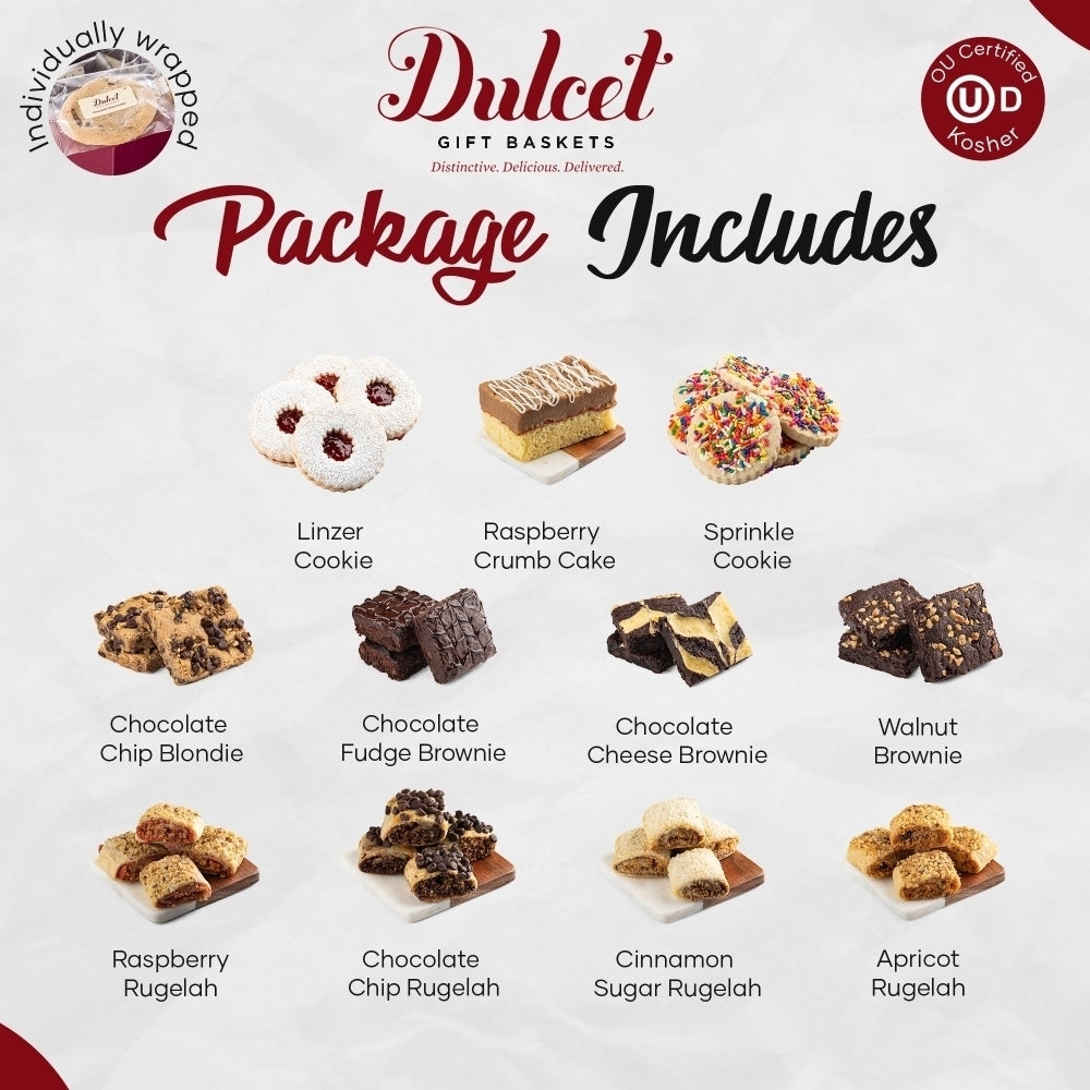 Dulcet Gift Baskets is here to bring you the gold standard in baked goods!All of our items are baked in our own bakery using the finest ingredients and highest standards of freshness. To view the nutritional information of each item, click on the links below. You can also find a list of items in each basket by going to the gift includes tab in the product detail page.