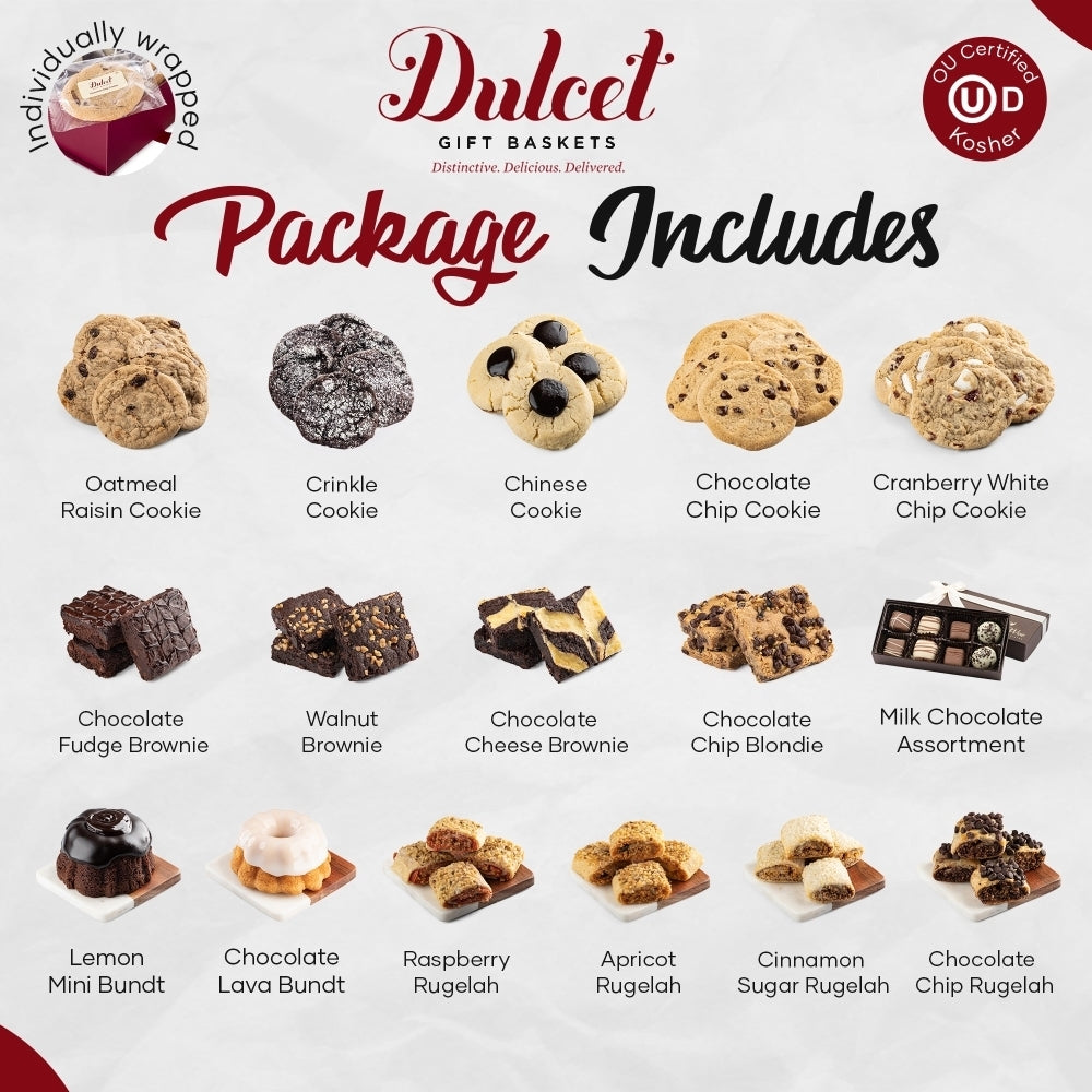 Dulcet Gift Baskets is here to bring you the gold standard in baked goods!All of our items are baked in our own bakery using the finest ingredients and highest standards of freshness. To view the nutritional information of each item, click on the links below. You can also find a list of items in each basket by going to the gift includes tab in the product detail page.