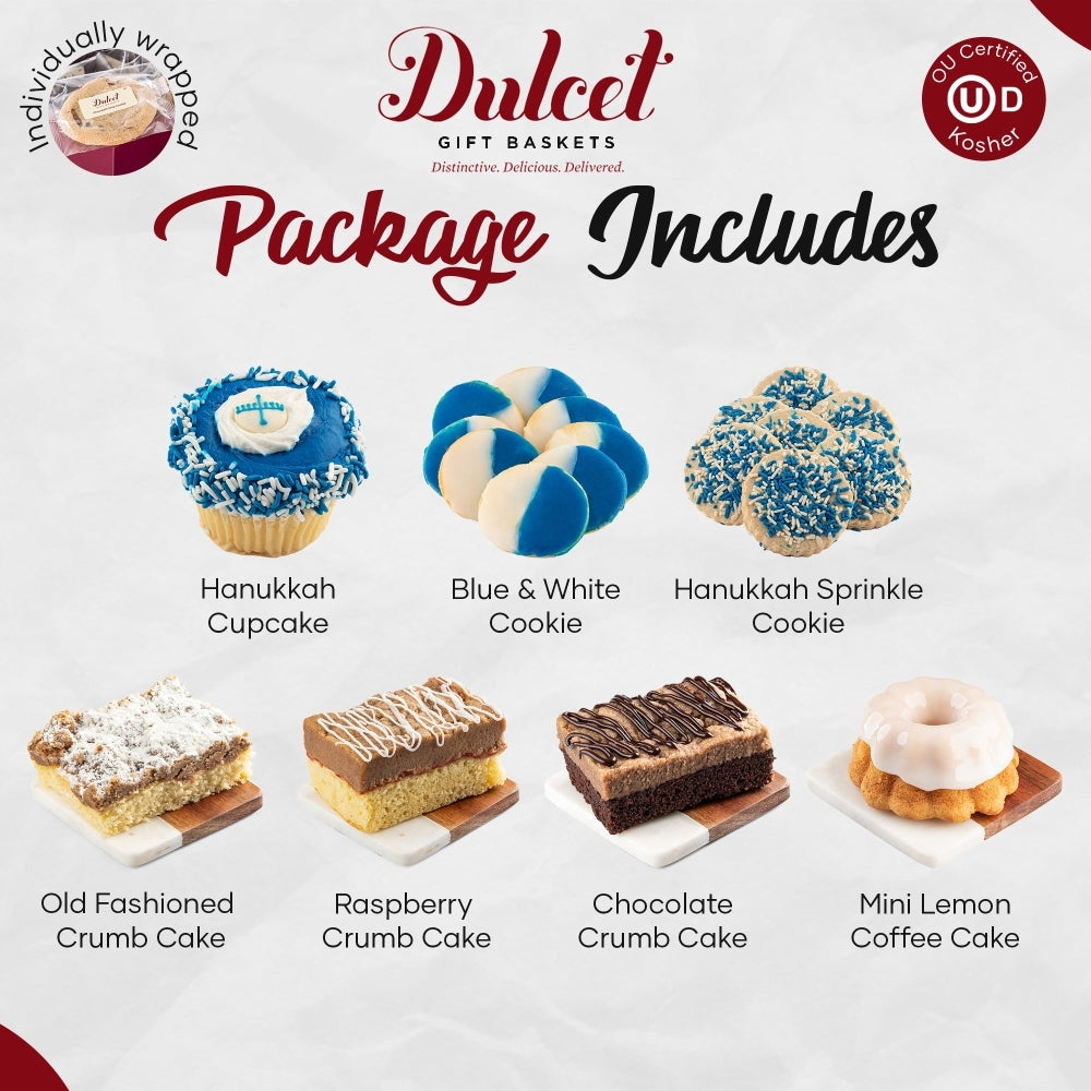Surprise your loved ones with this Hanukkah Grand Gift Basket Gourmet featuring mini light blue and whites, vanilla mini bundts, and other fresh goodies. These decadent pastries are unparalleled both in taste and elegance.
