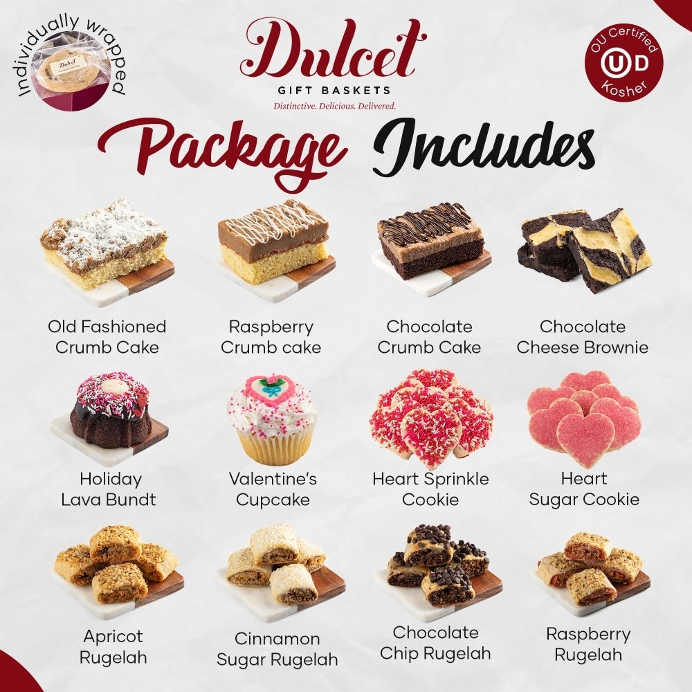 We will deliver these cardboard boxes to your loved ones and we can assure you they will find it delightful. What can be better than fruity rugelach, Mini Bundts, and a cute Heart-Topped Cupcake to round out the gift?