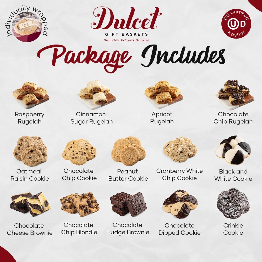 Dulcet Gift Baskets is here to bring you the gold standard in baked goods!All of our items are baked in our own bakery using the finest ingredients and highest standards of freshness. To view the nutritional information of each item, click on the links below. You can also find a list of items in each basket by going to the gift includes tab in the product detail page.