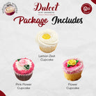 Fresh vanilla flavored cupcakes topped with various creative decorations nestle inside a cardboard box and tied with our trademark logo emblazoned ribbon.