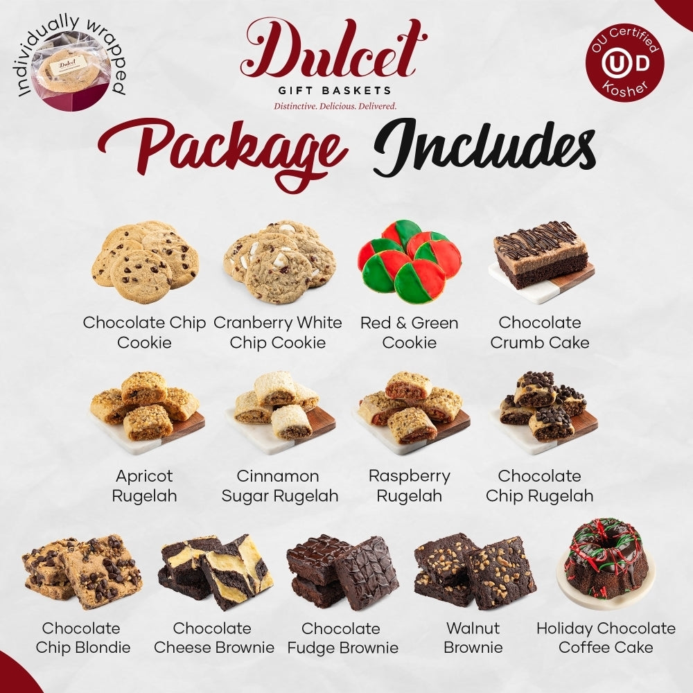 Dulcet Gift Baskets is here to bring you the gold standard in baked goods!All of our items are baked in our own bakery using the finest ingredients and highest standards of freshness. To view the nutritional information of each item, click on the links below. You can also find a list of items in each basket by going to the gift includes tab in the product detail page.