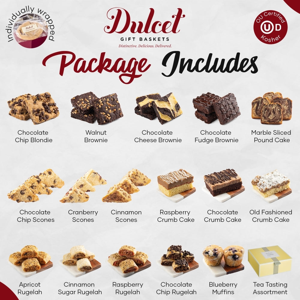Dulcet Gift Baskets is here to bring you the gold standard in baked goods!All of our items are baked in our own bakery using the finest ingredients and highest standards of freshness. To view the nutritional information of each item, click on the links below. You can also find a list of items in each basket by going to the gift includes tab in the product detail page.