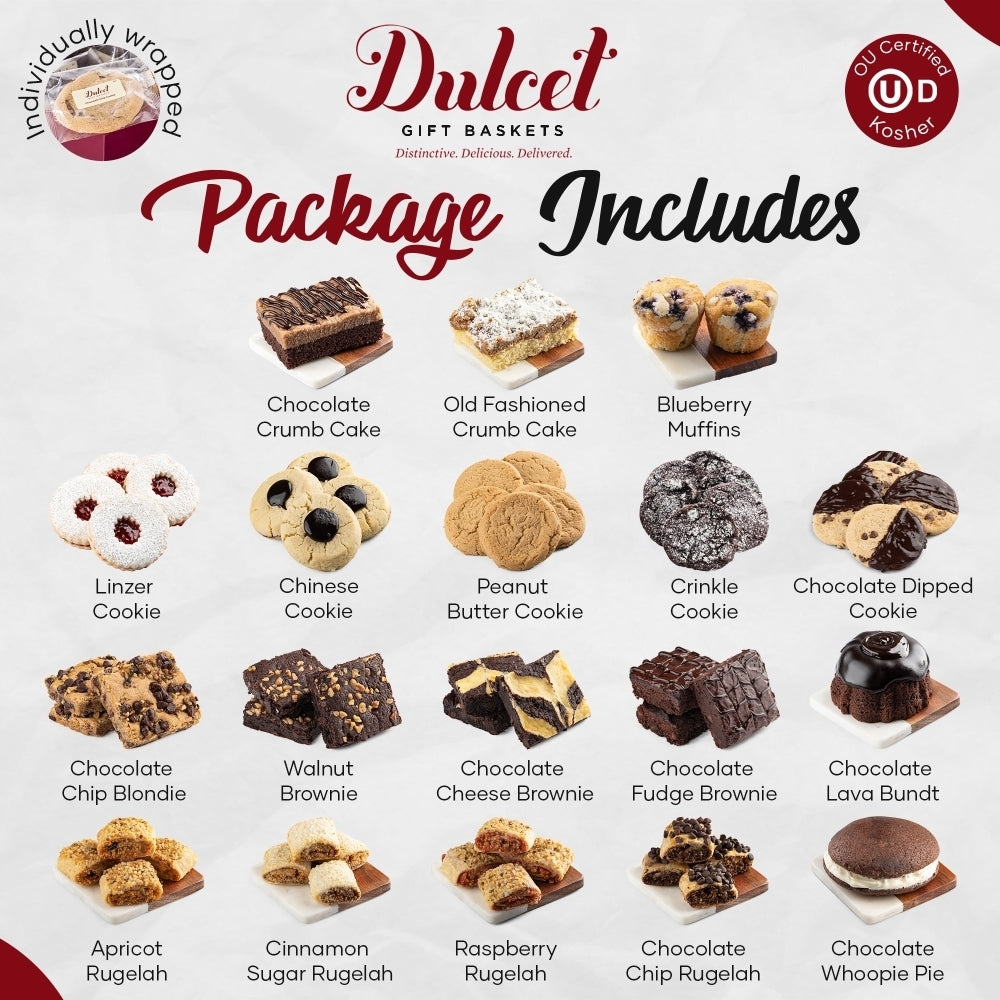 Dulcet Gift Baskets is here to bring you the gold standard in baked goods!All of our items are baked in our own bakery using the finest ingredients and highest standards of freshness. To view the nutritional information of each item, click on the links below. You can also find a list of items in each basket by going to the gift includes tab in the product detail page.