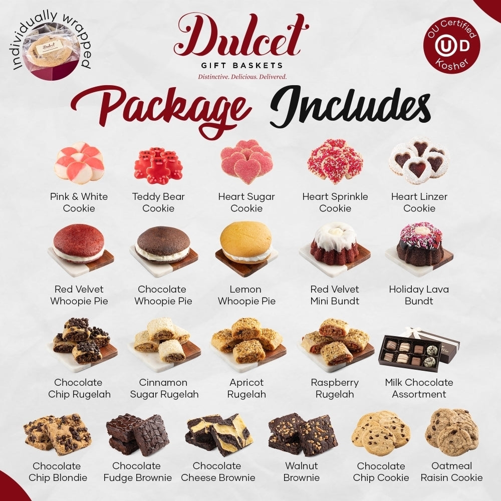 Dulcet Gift Baskets is here to bring you the gold standard in baked goods!All of our items are baked in our own bakery using the finest ingredients and highest standards of freshness. To view the nutritional information of each item, click on the links below. You can also find a list of items in each basket by going to the gift includes tab in the product detail page.