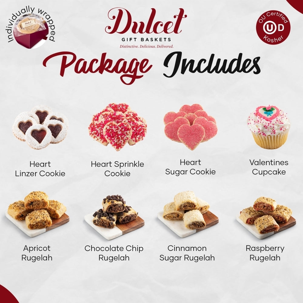 Be sweet with that special someone. Our Valentine’s Gift Basket Gourmet is filled with the finest cookies and cake hand frosted festively and sprinkled with crumbs/sugar/and icing for a decadent taste. Flaky ruggelach for a memorable gourmet lick. And the love you portray to last a lifetime. Arrayed in our signature box wrapped with care. This Gift Basket is the right way directly to their heart on this Valentine’s day!