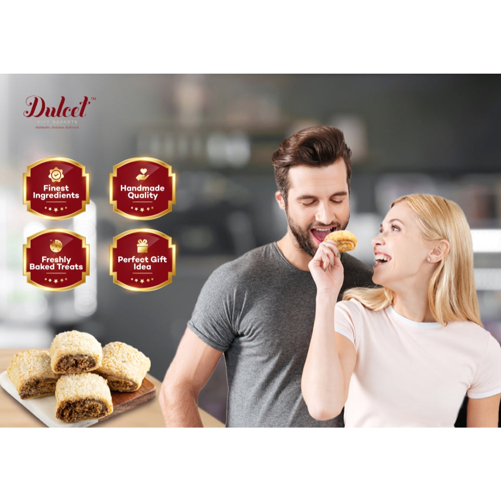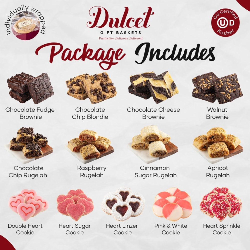Impress your valentine with The finest selection of baked goods. It's the perfect gourmet gift for your loved ones and is complete with trimmings, frills, and scrumptious goodies.
