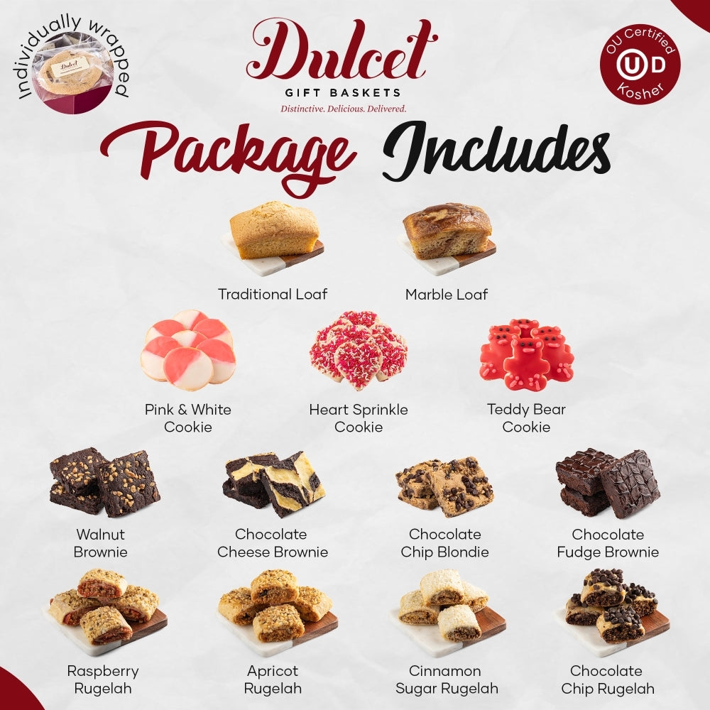 Dulcet Gift Baskets is here to bring you the gold standard in baked goods!All of our items are baked in our own bakery using the finest ingredients and highest standards of freshness. To view the nutritional information of each item, click on the links below. You can also find a list of items in each basket by going to the gift includes tab in the product detail page.