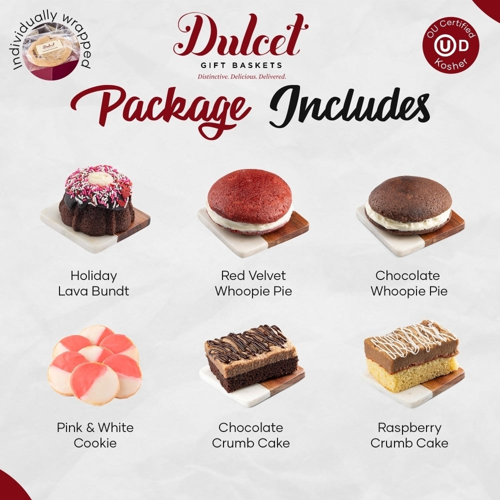 This deluxe selection includes mouthwatering chocolate lava bundts, fluffy whoopie pies, and chunky brownies, all wrapped up in a delightful wicker basket.