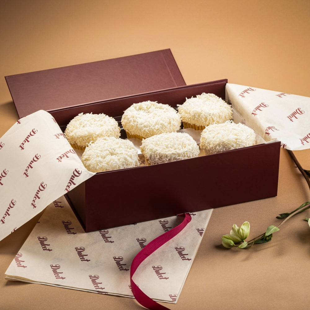 Brimming with fresh bourbon vanilla cupcakes, they are coated with coconut flakes for a flair of style.