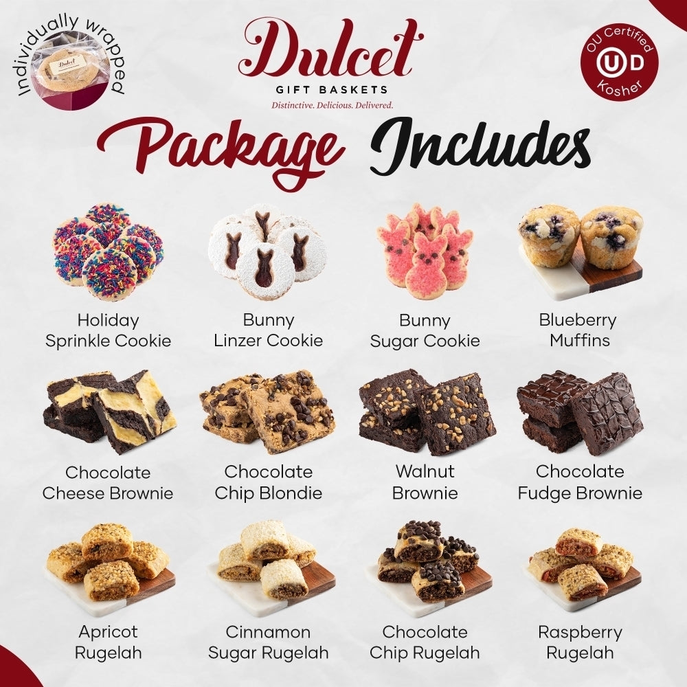 Dulcet Gift Baskets is here to bring you the gold standard in baked goods!All of our items are baked in our own bakery using the finest ingredients and highest standards of freshness. To view the nutritional information of each item, click on the links below. You can also find a list of items in each basket by going to the gift includes tab in the product detail page.
