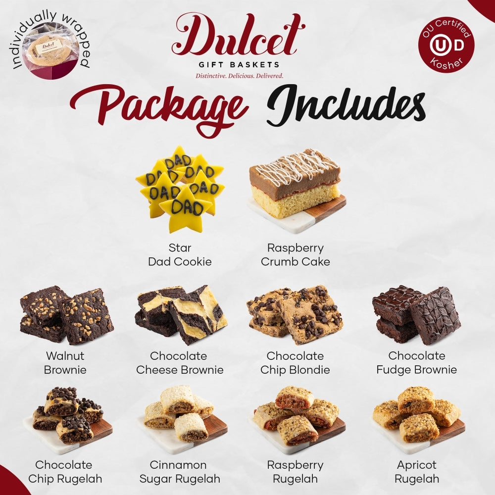 #1 DAD STAR COOKIES TOP OFF UNIQUE COLLECTION: This classy package showcases a collection of rugelach, brownies, and a crumb cake that is bursting with rich flavor. It also features beautiful, hand-designed star-shaped cookies that scream” #1 Dad” from their cheerful yellow icing. It’s like sending dad a loud round-of-applause!