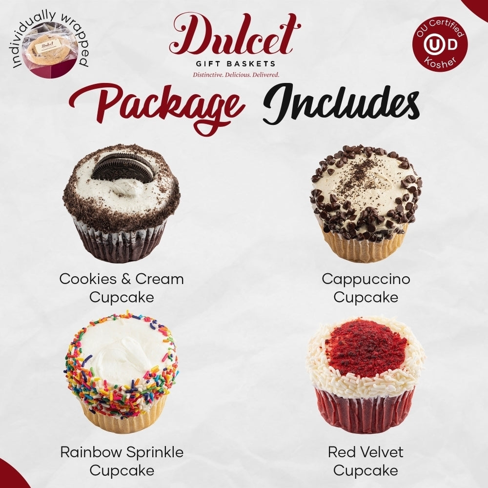 What better way to celebrate an important accomplishment than with our cupcake variety pack? Featuring 4 delicious flavors and thick, flavorful icing, these frosted cupcakes are the right choice for the whole family! The assorted cupcake gift box has something for everyone, from a more exotic cappuccino flavor to more traditional chocolate with cookie crumbs and even the timeless and elegant red velvet. The cupcake box for delivery is delivered fresh at your doorstep and comes in beautiful packaging that makes for a lovely gift.