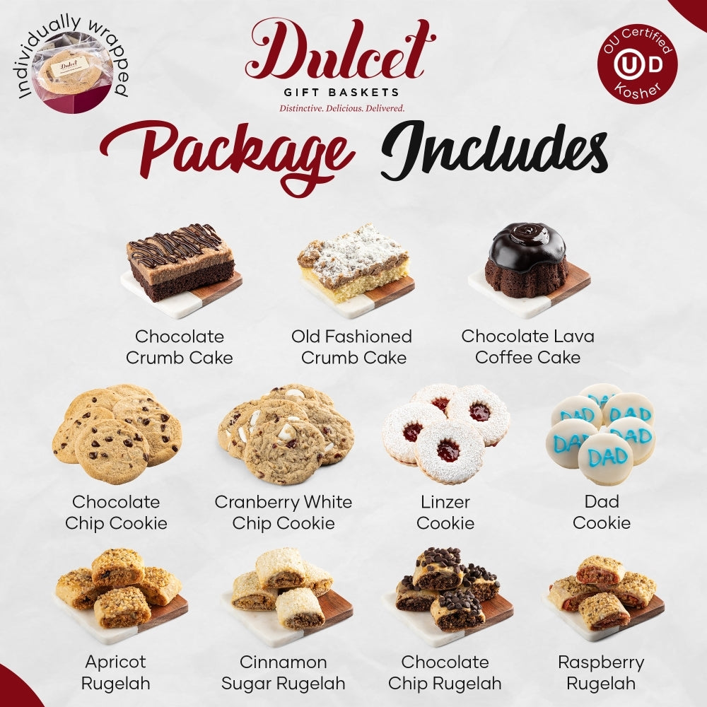 Dulcet Gift Baskets is here to bring you the gold standard in baked goods!All of our items are baked in our own bakery using the finest ingredients and highest standards of freshness. To view the nutritional information of each item, click on the links below. You can also find a list of items in each basket by going to the gift includes tab in the product detail page.