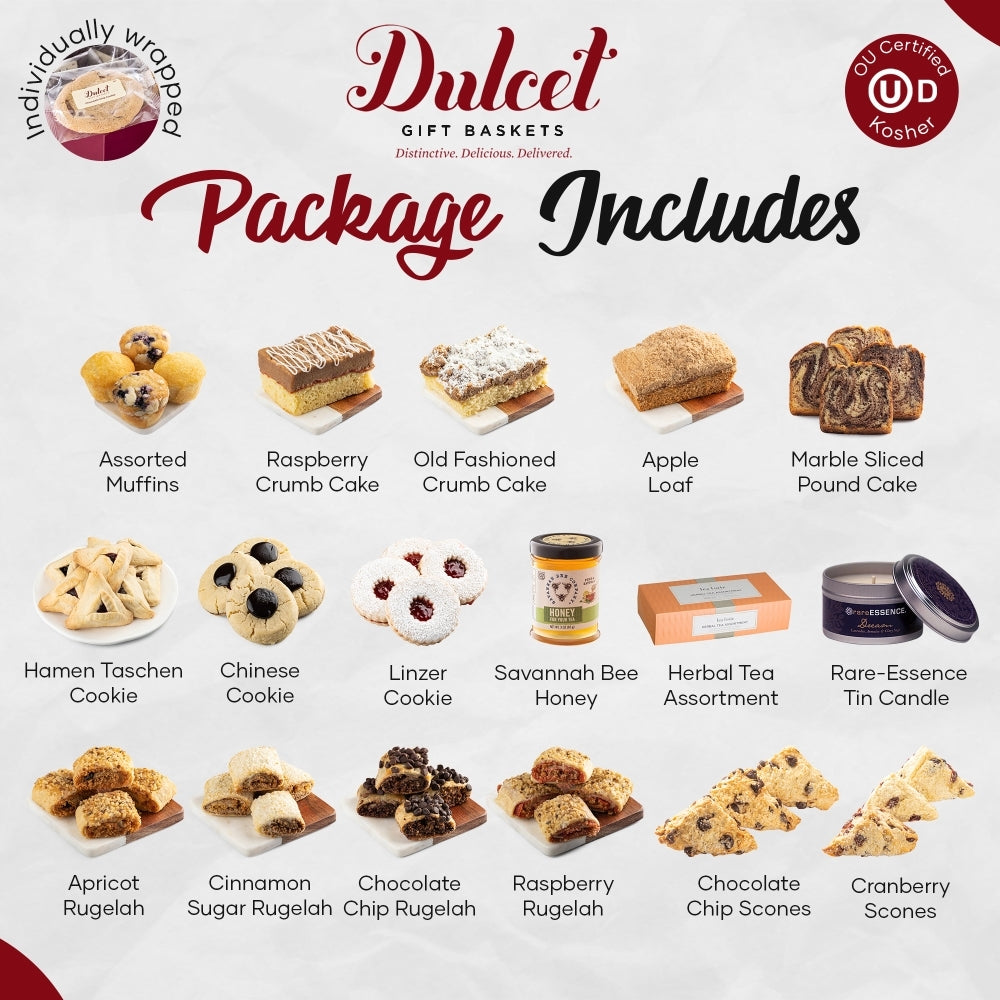 Dulcet Gift Baskets is here to bring you the gold standard in baked goods!All of our items are baked in our own bakery using the finest ingredients and highest standards of freshness. To view the nutritional information of each item, click on the links below. You can also find a list of items in each basket by going to the gift includes tab in the product detail page.