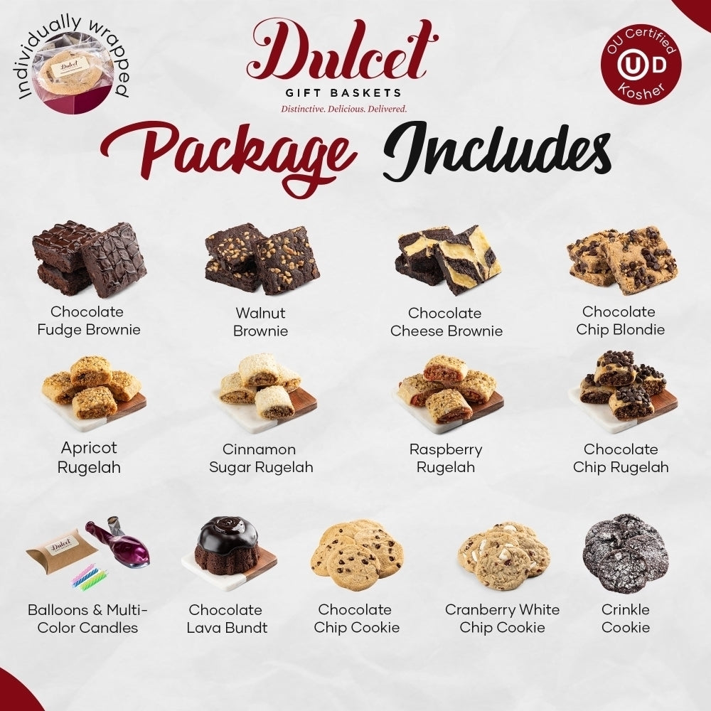 Includes a collection of the finest baked goods, fresh and delicious, with colored candles and balloons that make a memorable gift!