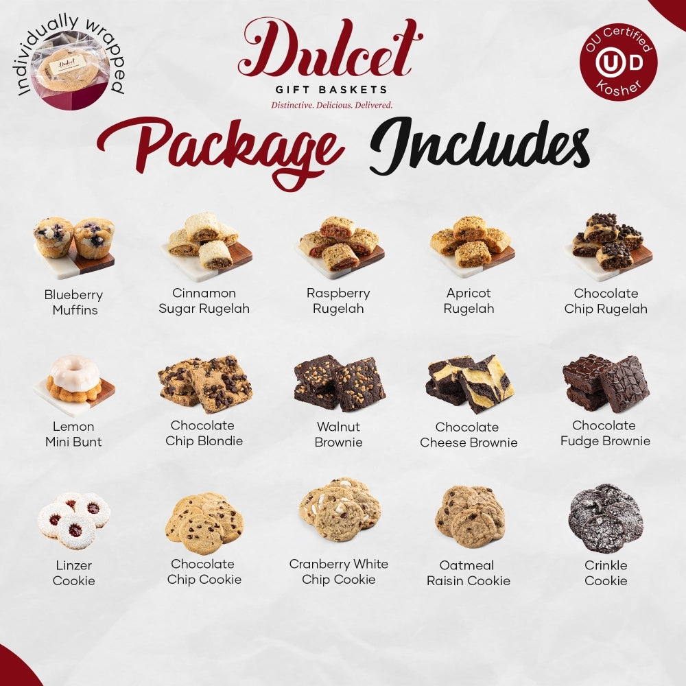 Dulcet Gift Baskets is here to bring you the gold standard in baked goods!All of our items are baked in our own bakery using the finest ingredients and highest standards of freshness. To view the nutritional information of each item, click on the links below. You can also find a list of items in each basket by going to the gift includes tab in the product detail page.