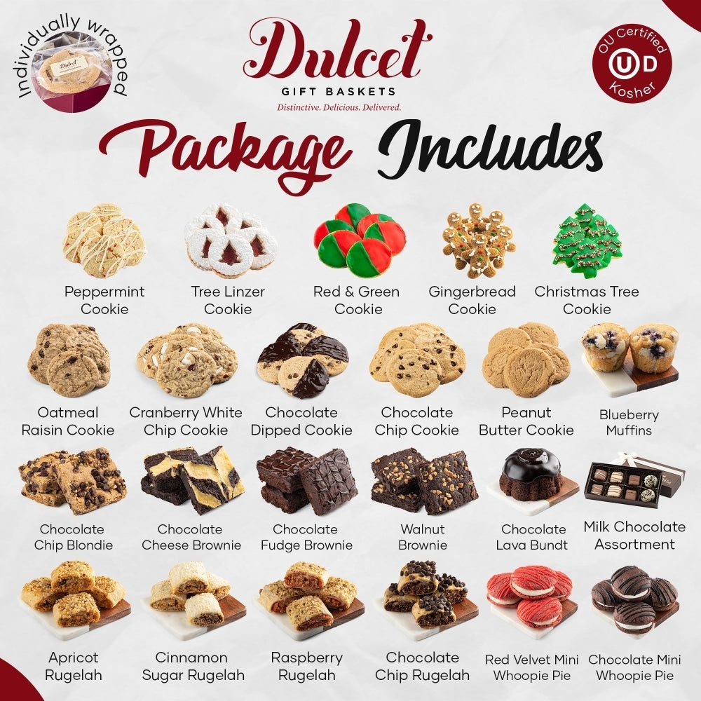 Dulcet Gift Baskets is here to bring you the gold standard in baked goods!All of our items are baked in our own bakery using the finest ingredients and highest standards of freshness. To view the nutritional information of each item, click on the links below. You can also find a list of items in each basket by going to the gift includes tab in the product detail page.