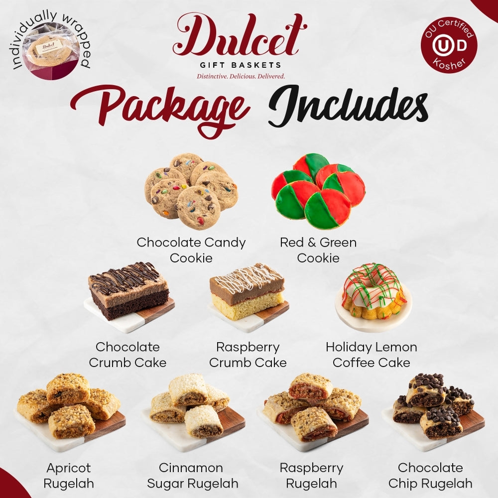 Dulcet Gift Baskets is here to bring you the gold standard in baked goods!All of our items are baked in our own bakery using the finest ingredients and highest standards of freshness. To view the nutritional information of each item, click on the links below. You can also find a list of items in each basket by going to the gift includes tab in the product detail page.