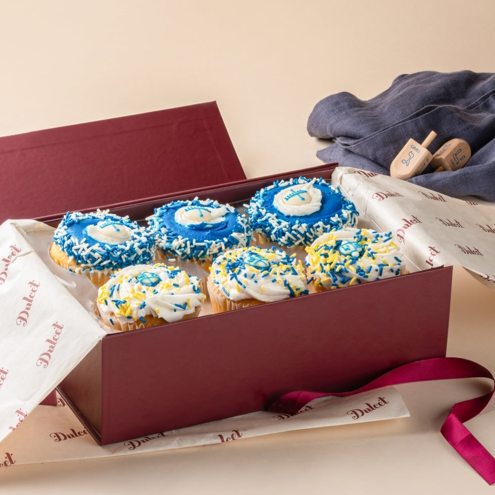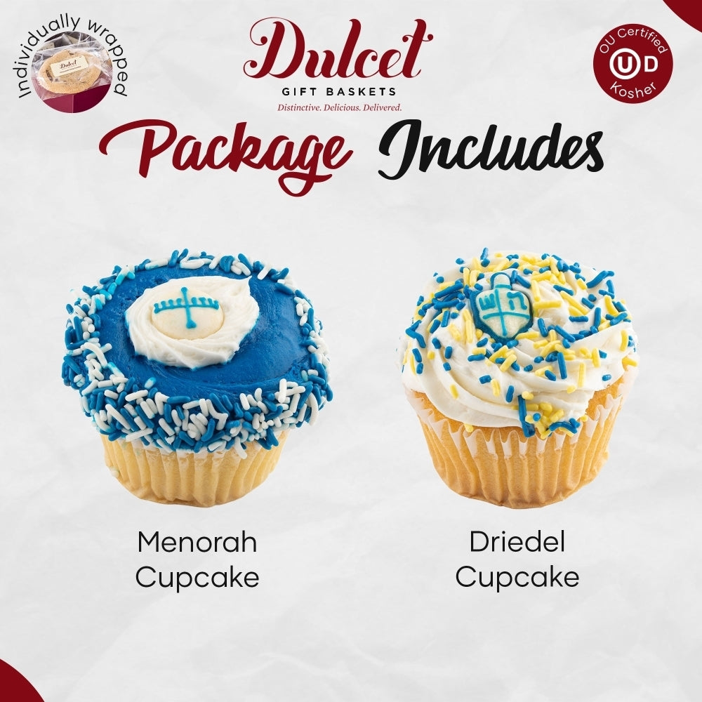 Send ‘Happy Hanukkah’ wishes to friends, family, and colleagues with this Gourmet Kosher Hanukkah Gift Basket. Dulcet’s Hanukkah Gift Basket Gourmet includes 3 vanilla cupcakes, and 3 chocolate cupcakes, hand frosted and iced festively for this special holiday. The rich and decadent cake arrives in our signature box, tied with ribbon, and ready for gift giving. Happy Hanukkah