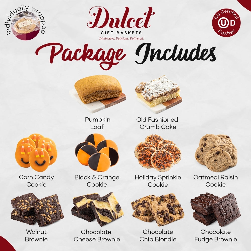 Whether it’s a friend, colleague, or family member, Dulcet’s Halloween Wicker Gift Basket will delight them with its mix of spooky Halloween-inspired cookies and soft pumpkin specialty bread.