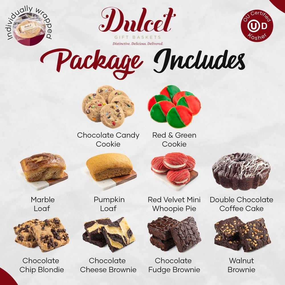 Dulcet Gift Baskets is here to bring you the gold standard in baked goods!All of our items are baked in our own bakery using the finest ingredients and highest standards of freshness. To view the nutritional information of each item, click on the links below. You can also find a list of items in each basket by going to the gift includes tab in the product detail page.
