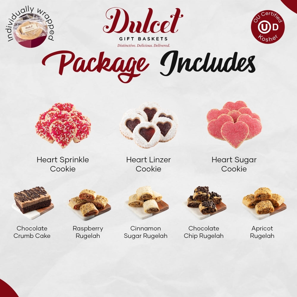 Adorable heart-shaped Linzer tarts dusted with white sugar, raspberry-filled rugalach, and red sprinkled vanilla cookies make a great Valentine's day gift!