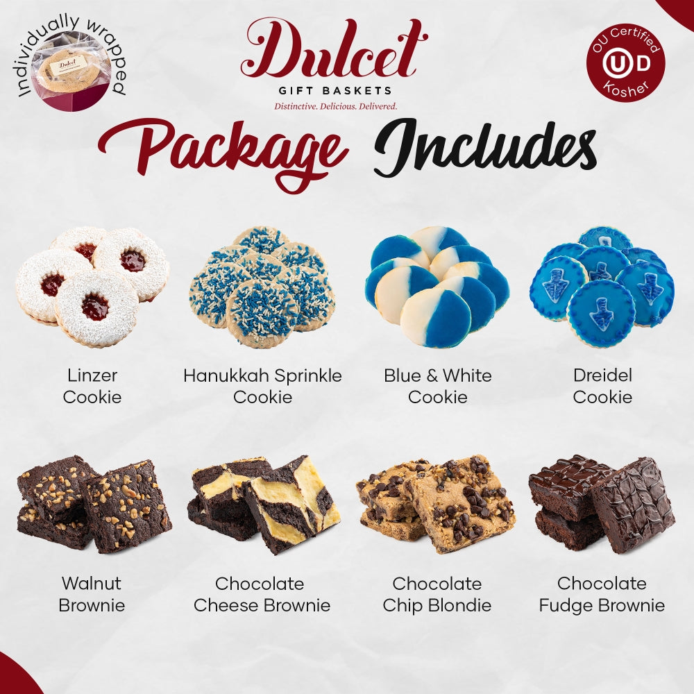 The perfect gift basket where sweetness and decadence meet to form something heavenly. Enjoy the cookies with the full knowledge that they are baked from the finest ingredients like Belgian chocolate and Grade-A eggs. Captivate family and friends with a deluxe arrangement of Hanukkah delights. Spread the season's cheer with our heartwarming, goodie gift basket filled with treats for everyone. The gift Box includes 7 Assorted Hanukkah Cookies- Flavors include: Sprinkle, Blue and White, Dreidel and Linzer, 4 Assorted Brownies Flavors include: Chocolate Fudge, Chocolate Cheese, Chocolate Chip Blondie, and/or Walnut. Far more appreciated than the standard gift, Dulcet Gift Baskets Deluxe Hanukkah Dreidel Cookie Gift Basket Great Gift for Family, 11 Pcs Multipack Quantity 1
