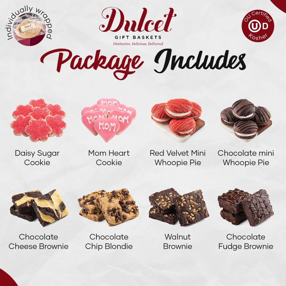 Dulcet has combined a whimsical collection of pleasing baked goods, just what Mom would like. Freshly baked vanilla cookies covered in pink icing, heart-shaped ‘Mom’ cookies, and plump whoopie pies are great accompaniments to a warm mug of cocoa…