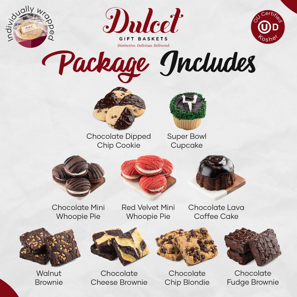 Is your friend a football fanatic? Hyped up for Super Bowl season? Express your love with a unique, sweet gesture. Our Football Fan's Favorite Gift Box features some of our popular rich brownies, lava bundt, whoopie pies, and of course a delicious football-themed cupcake. Each of these pastries is hand-made with love and the finest, local, ingredients for ultimate freshness. Include a personal message and transform these treats into something more than simple comfort food. While they're busy living the game, you'll be in her/his heart. Happy Gifting!