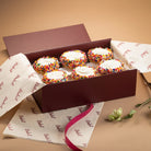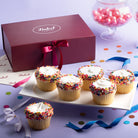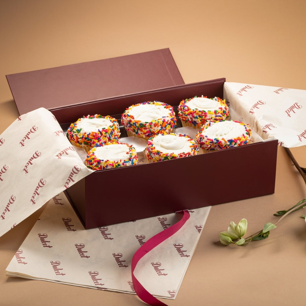 Finally,The awaited day has arrived! Dresses impeccably,perfect to a whim. And the surprise will surely rock along. Unwrapping the gift everyone goes wild. Lying there is Dulcets Best Rainbow Sprinkled Cupcakes in the most elegant Gift Basket. Madagascar Bourbon vanilla cream cake topped with moist & smooth cream butter edged with a splatter of colored sprinkles. An enticing & hearty gift to send your wishes with..... Arrives in Our Signature Gift Box hand wrapped with care. Finished with a bow this gift basket is ready for gift giving.